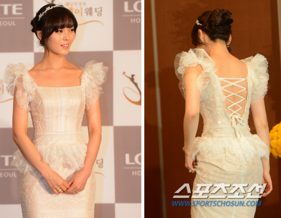 본식 드레스는 결혼식 직전 기자회견 때 입은 '머메이드 스타일'의 웨딩드레스와 달랐다. 선예는 기자들 카메라 앞에서 날씬한 몸매와 아찔한 쇄골라인이 드러나는 인어라인 드레스로 로맨틱한 분위기를 살린 바 있다. 또 깔끔하게 묶은 머리 위에는 티아라를 매치해 화사한 공주 같은 분위기를 더했다. 특히 청순한 앞모습과는 달리 코르셋 느낌의 파격적인 반전 뒤태로 눈길을 끌었다.
