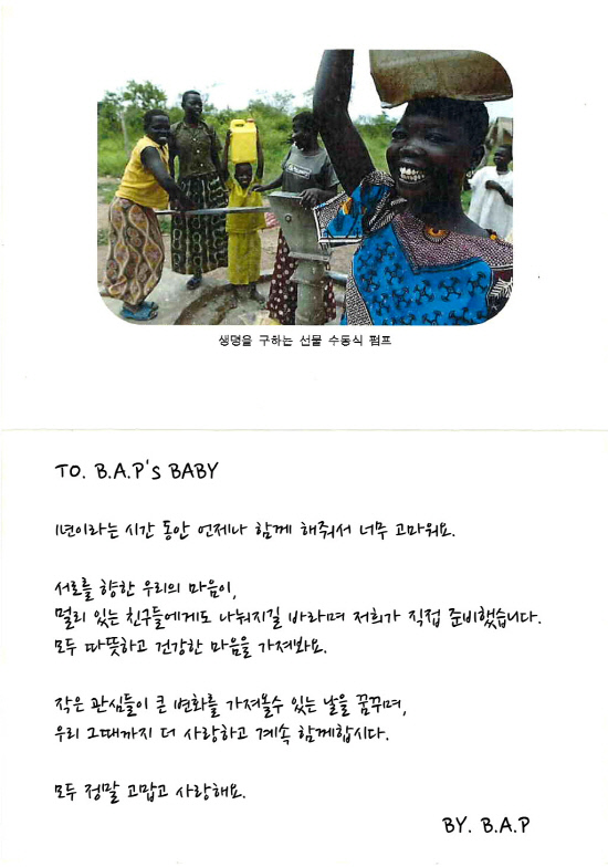 B.A.P는 지난 27일 데뷔 1주년을 기념해 'B.A.P´s BABY'란 팬덤명으로 유니세프에 기부했다. 이들은 팬카페를 통해 '1주년 기념, 베이비들을 위한 B.A.P의 선물'이라며 아프리카 주민들에게 선물한 수동식 펌프 사진과 팬들에게 전하는 메시지를 담은 카드를 공개해 훈훈함을 더하기도 했다.