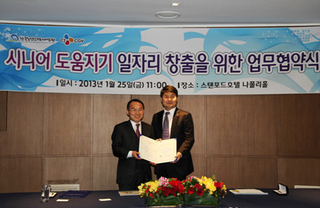 CJ CGV가 보건복지부 산하 한국노인인력개발원(원장 박용주)과 새로운 시니어 일자리 창출을 위한 '도움지기' 사업 업무협약(MOU)을 체결했다.