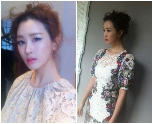 또 다른 사진에서는 가슴 윗부분이 살짝 시스루로 처리된 고풍스러운 색상의 원피스를 입고 한 줌에 잡힐 듯한 개미 허리를 드러내 눈길을 끈다.