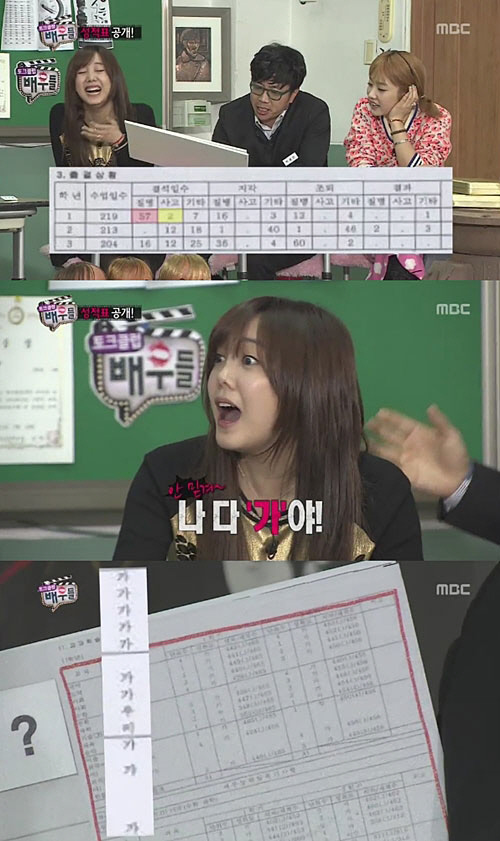 이를 본 MC들은 매우 놀라워했고, 특히 배우 박철민은 "찬란하구나"라고 성적표를 평가해 웃음을 자아냈다.
