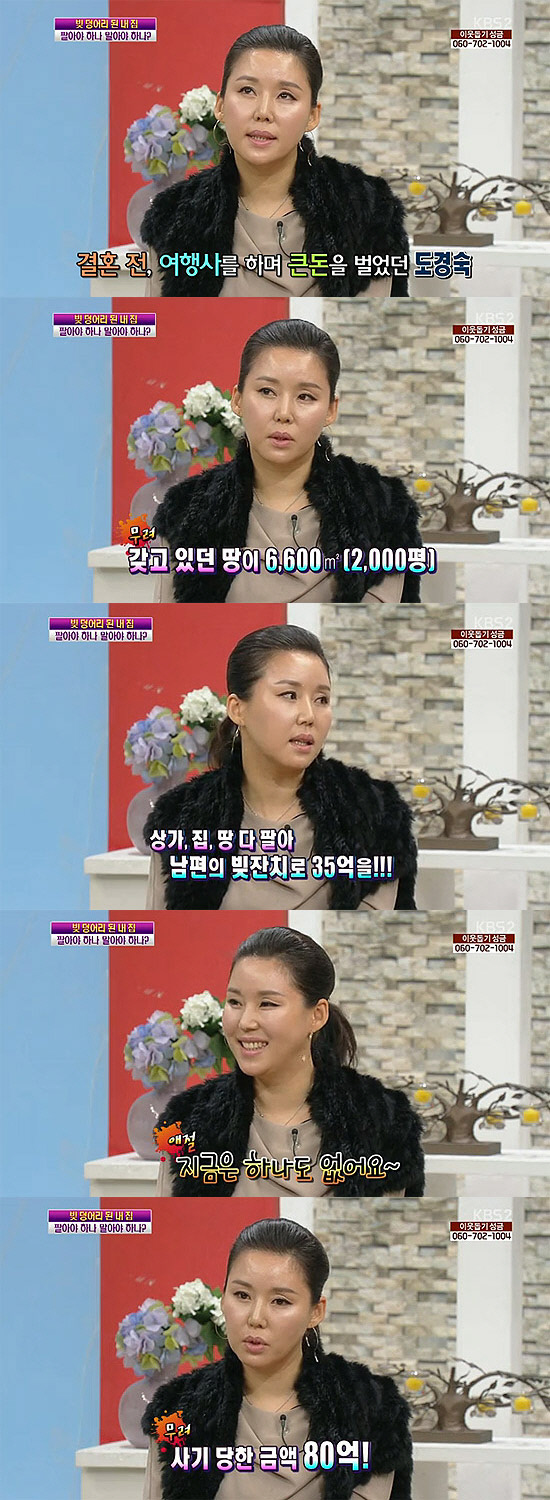 하지만 도경숙은 "결혼 후 남편이 사기당한 금액이 80억이다. 상가, 집, 땅 다 팔아서 35억 빚잔치를 했다. 지금도 원금을 갚아 나가는 중이다"고 말해 안타까움을 자아냈다.