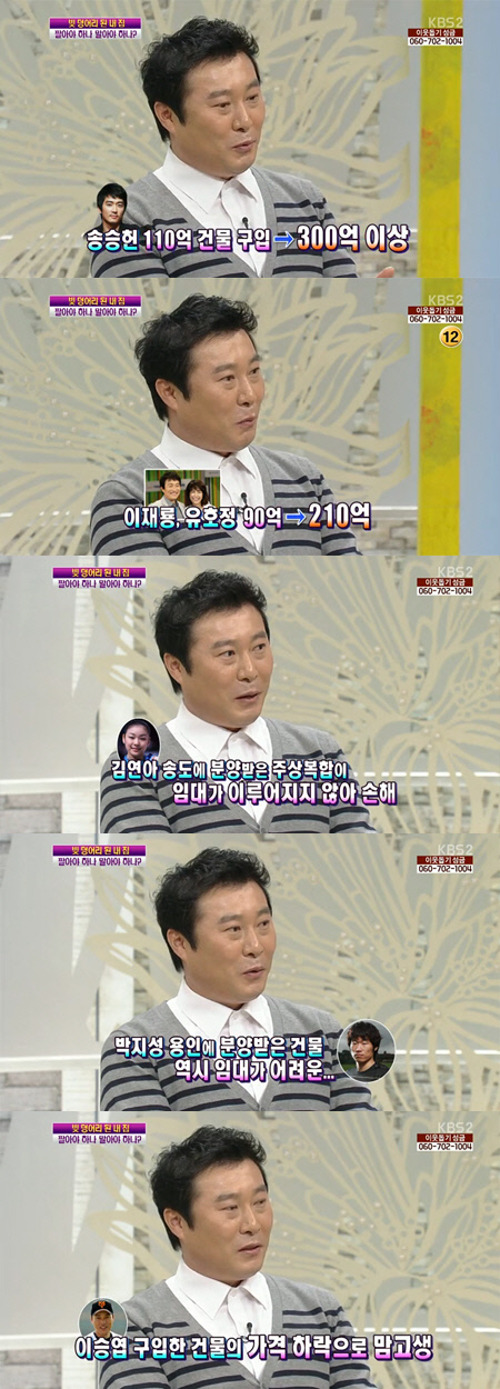 이어 "야구선수 이승엽은 일본에 진출하면서 큰돈을 들여서 건물을 샀지만 가격하락으로 마음고생을 하고 있다"고 설명했다. <스포츠조선닷컴>