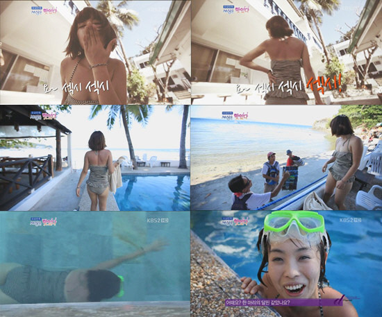 특히 잘록한 허리 뿐 아니라 아찔한 반전 볼륨 몸매로 네티즌들의 시선을 사로 잡았다. 더불어 얼굴 클로즈업에도 귀여운 표정을 지으며 돌고래 같은 수영실력을 뽐내며 색다른 매력을 과시하기도 했다.