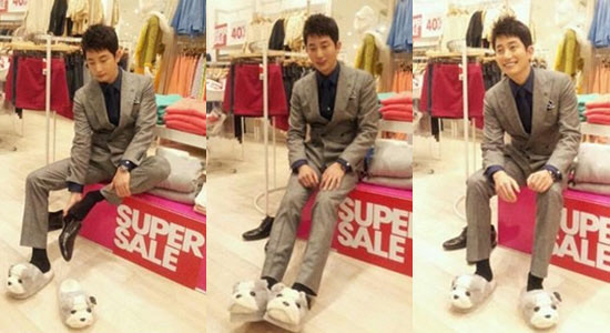 사진을 본 네티즌들은 "정장 차림에 슬리퍼 신고 빙구 웃음 이라니!", "너무 천진난만해 보여요", "여심을 홀리는 미소", "완전 귀요미"등의 반응을 보였다.