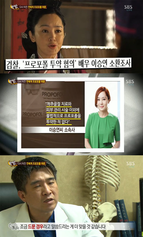 지난 30일 방송된 SBS '한밤의 TV연예'에서는 최근 프로포폴 투약 혐의로 검찰 조사를 받고 있는 이승연에 대해 집중 조명했다.
