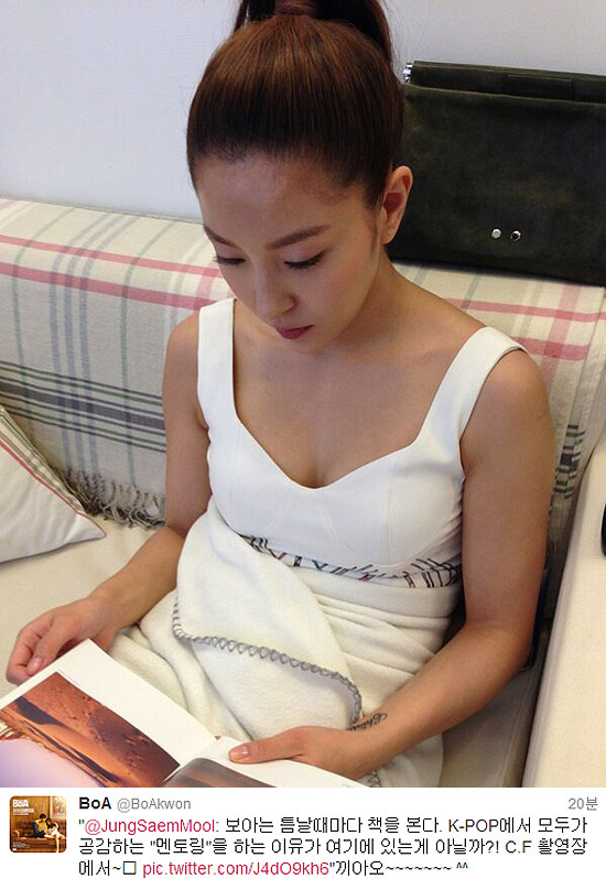 2월 1일 보아의 트위터에는 "보아는 틈날 때마다 책을 본다. K-POP에서 모두가 공감하는 '멘토링'을 하는 이유가 여기에 있는 게 아닐까?! CF 촬영장에서"라는 글과 함께 한 장의 사진이 게재됐다.