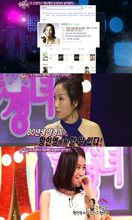 이에 정경미는 "내가 분명히 고등학교 3학년 때 대학 입시를 하러 갔다. 그 학교에 황인영이 있었다"며 의문을 제기했다.