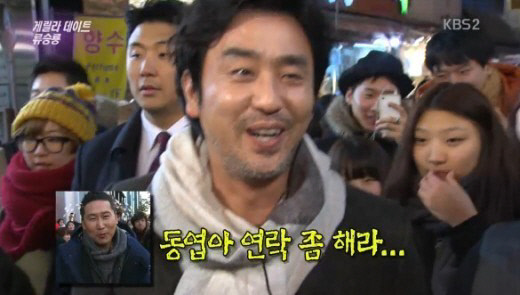 2일 방송된 KBS2 '연예가중계'에서 류승룡은 '최고 전성기다. 서울예대 동기들이 좋아할 것 같다'는 말에 "다들 축하해주신다"고 답했다. 그는 "정재영은 나를 견제하고 황정민은 자신과 갈 길이 다르다며 시크한 반응을 보인다. 신동엽과는 연락이 안 된지 좀 됐다. 동엽아, 연락 좀 하자"고 말해 주변을 폭소케 했다.
