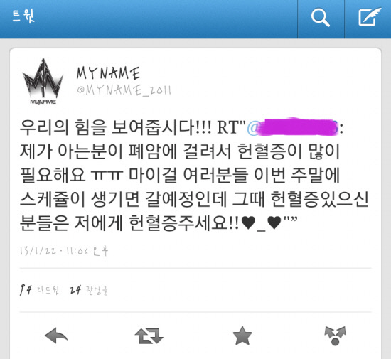마이네임의 한 팬은 자신의 지인이 폐암에 걸려 헌혈증을 찾는다는 내용의 SNS글을 남겼고, 이를 우연히 보게 된 인수가 "헌혈증을 모으자"는 글을 게재한 뒤 그 팬을 찾아 자신의 헌혈증과 싸인CD는 물론 "빨리 완치되시길 바란다"는 격려 인사를 몰래 전달한 것. 또 마이네임 팬들도 헌혈증 기증에 동참해 훈훈함을 더했다.