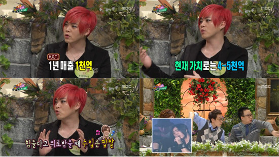 이날 방송에서 MC 박명수는 "H.O.T. 한창 일 때는 수입이 엄청 났을 것 같다. CF 한편 당 얼마나 받았느냐"고 묻자 문희준은 "내가 듣기로는 거의 1년에 번 돈이 천억 정도 된다고 들었다"고 말해 충격을 안겼다. 이어 "18년 전에 천억 이었으니까 지금 돈으로 하면 1년에 4-5천억 된다"고 덧붙여 출연진들의 입을 떡 벌어지게 했다. 또 "그때는 사실 돈을 많이 벌지는 못했다. 그때 수입은 회사 매출이었다. 솔직히 솔로 데뷔해서 수입이 증가했다"며 "많은 사람들이 제가 힘들었다고 생각했을 때 뒤로 돈은 많이 벌었다"고 솔직히 고백했다.