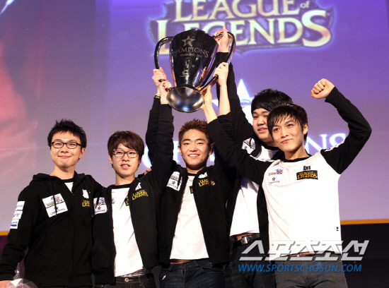 '올림푸스 LOL 챔피언스 윈터 2012~2013' 우승을 차지한 나진 소드 선수들이 우승컵을 들고 기쁨을 만끽하고 있다. 사진제공=온게임넷