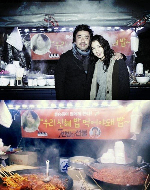절친한 동료에게 밥차를 선물하기도 한다. 류승룡은 함께 영화 '7번방의 선물'에 출연한 박신혜가 주연을 맡은 tvN드라마 '이웃집 꽃미남' 촬영장에 밥차를 선물해 눈길을 끌었다. 류승룡은 "우리 신혜 밥 먹야야 돼 밥~"이라고 쓰인 주황색 플랜카드까지 곁들이며 마음을 전했다. 배우 김남길도 절친한 동료 장나라를 위해 이달 초 '학교 2013' 촬영장에 분식차를 선물했다. 그는 이 선물이 열애설로 발전해 곤혹스러운 상황을 맞기도 했다.