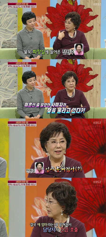 그는 "화장실에서 우는 아이를 안고 젖을 먹이고 있는데 불쑥 화장실에 들어온 전원주랑 마주쳤다"며 "전원주도 내가 처녀인 줄 알고 있었는데 모유 수유하는 것을 보고 말 한마디 못하고 너무 놀라더라. 나중에 들은 얘기지만 전원주가 소변을 지릴 만큼 놀랐다고 하더라"며 당시를 회상했다.