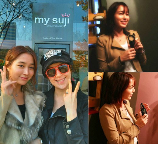 사진 속 이민정은 환한 미소로 오픈 축하 멘트를 전하고 있는 모습. 또 다른 사진에서는 이은희가 운영하는 레스토랑 앞에서 손으로 브이(V)를 그리며 나란히 다정한 포즈를 취하고 있다.