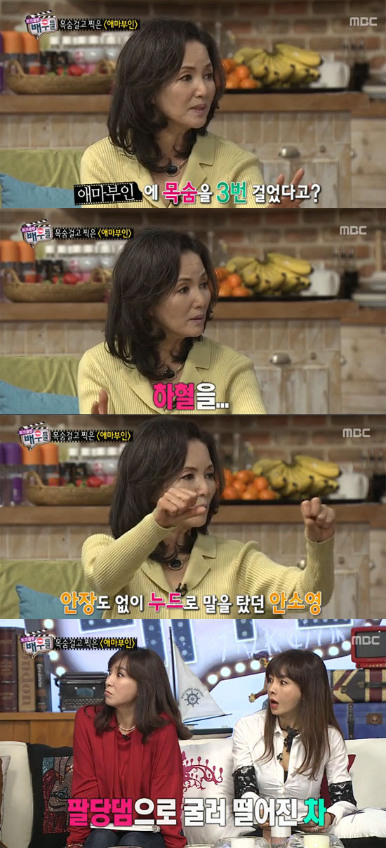 4일 방송된 MBC '토크클럽 배우들'에 출연한 안소영은 "영화 '애마부인'은 내 목숨을 세 번이나 내놓고 찍은 작품"이라고 촬영 비하인드 스토리를 공개했다.