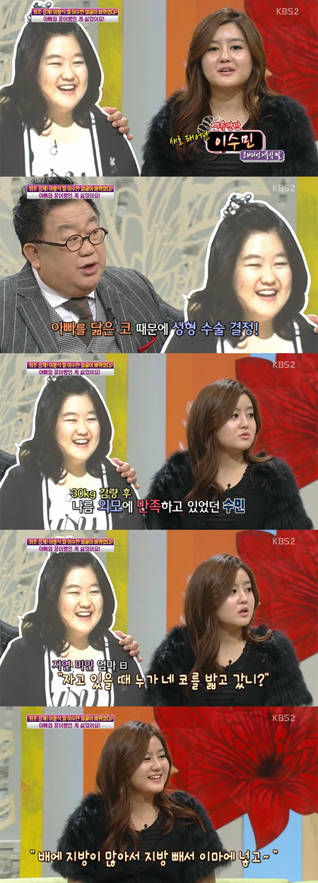 아빠 이용식을 닮은 코 때문에 성형수술을 결심하게 됐다는 이수민은 "처음에는 성형의지가 없었다. 체중을 30kg 감량한 후에는 내 외모가 못나지 않고 봐줄 만 하다고 생각했다"고 털어놨다.