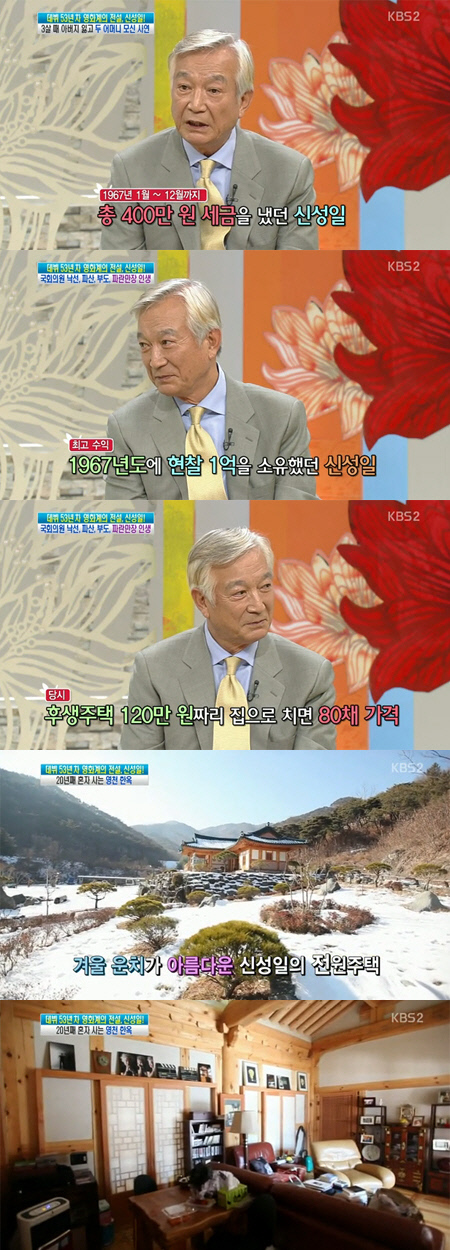 또한 이날 방송에서는 경북 영천에 있는 신성일의 한옥이 공개됐다. 오대산 금강송 나무로 만들어진 한옥은 '신성일 기념관'이라고 해도 무방할 정도로 젊은 시절부터 현재까지 신성일의 모습을 볼 수 있는 사진이 집안 곳곳에서 전시돼있어 눈길을 끌었다.