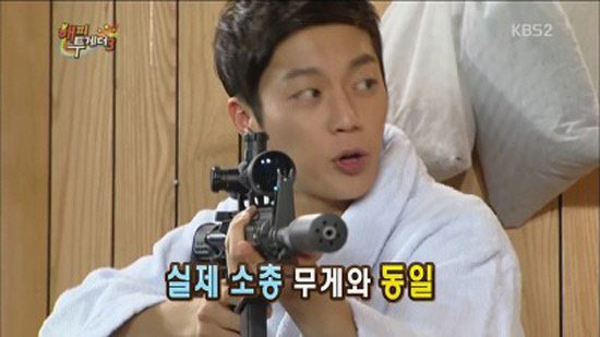 심지어 흔한 댄스타임보단, 총기난사(?) 퍼포먼스를 보인 것조차 신선한 발상이었다. 게스트들이 아이리스2에서 사용한 촬영용 총기를 토크쇼에 가져온 것이다. 윤두준은 촬영용 총기는 실제 총기를 촬영 목적에 맞게 안전하게 개조한 것이지만, 형태와 무게가 실제 총기와 같아 연기를 병행하는 초보입장에서 다루기가 쉽지 않았음을 털어놨다.