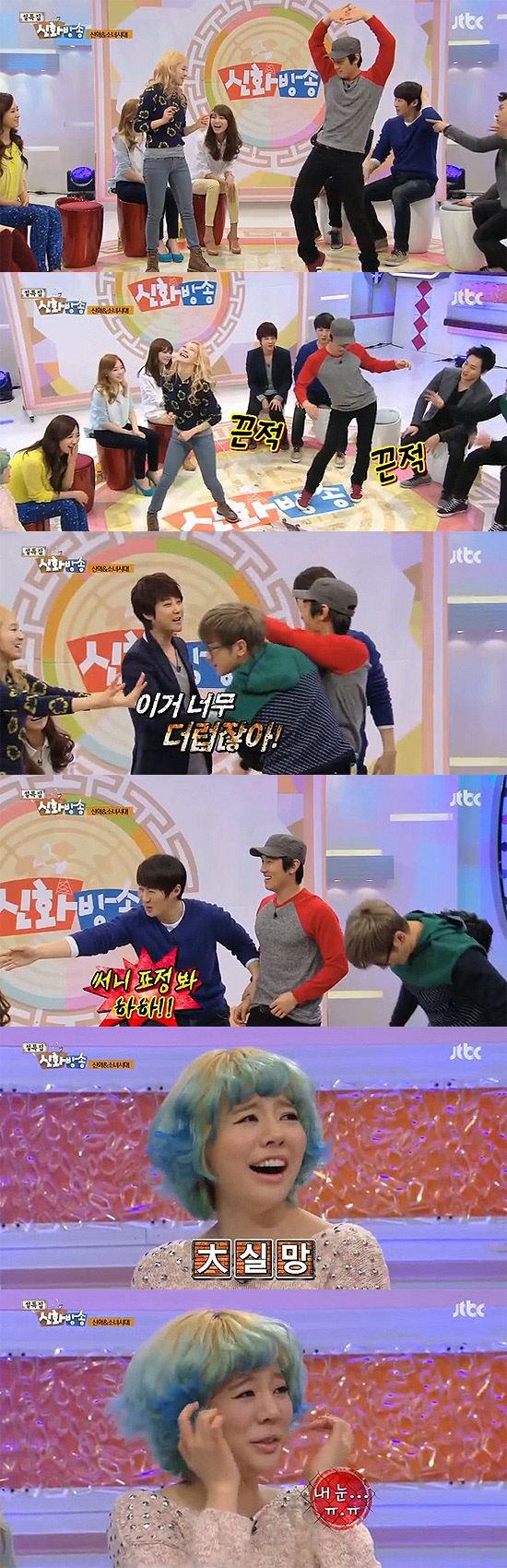 신화 멤버 전진은 김동완의 춤을 저지하며 "써니 표정 봐"라며 폭소했고 써니는 김동완에 "오빠!"라고 버럭 화를 내며 고개를 돌렸다.