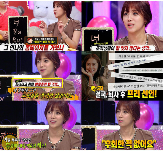 당시 만류한 이들이나 일부 대중은 <상상플러스>로 최고의 주가를 누리던 아나운서가 험난한 배우의 세계를 가고자 했을 때, '호강에 겨운 일'이라고 말을 했던 것을 기억한다. 하지만 그런 결정이 절대 쉬운 일이 아니라는 것은 입장 바꿔 생각해 보면 알 것이다. 누가 지금 누리는 부귀영화를 놓치려 하겠는가!