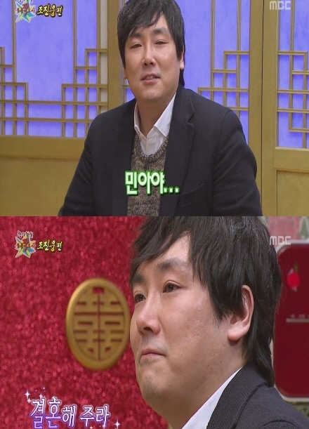 14일 방송된 MBC '무릎팍도사'에서 조진웅은 "여자친구가 고 3일 때 부산 연기학원에서 입시생과 연기 선생님 관계로 만났다. 처음 볼 슌부터 마음에 들었다. 여자친구가 서울에 온 뒤 적극 대시해 연인 사이로 발전, 7년간 교제했다. 지난해 양가 부모님을 모시고 상견례를 마쳤다"고 밝혔다. 이에 강호동은 "녹화분 방송 날이 밸런타인 데이다. 방송으로 프러포즈 할 기회를 드리겠다"고 제안했고, 조진웅은 "여자친구가 프러포즈를 굉장히 기대한다"며 "민아야, 가끔 네개 왜 내 옆에 있을까 생각해본다. 넌 날 정말 믿어주고 내가 어디가도 기 안죽게 해주는 사람이다. 오늘 아침에도 유일하게 문자 보냈더라. 그런 네가 난 앞으로도 계속 필요할 것 같다. 결혼해주라"며 눈물을 보였다.