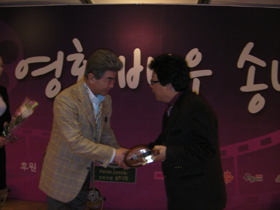 영화계를 빛낸공로로 지난해 연말 (사)한국영화배우협회로부터 공로상을 수상한 장태령 감독. 배우 이덕화가 패를 수여하며 악수를 나누고 있다.