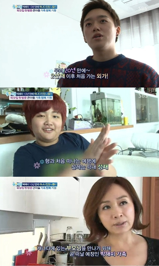 박해미의 큰 아들 성민 씨는 얼마 전 군을 제대했고, 서울대 공대에 재학중인 사실이 알려지면서 엄친아로 화제를 모은 바 있다. 특히 훤칠한 키에 쌍커플 짙은 매력적인 눈을 가진 성민 씨는 중저음 목소리에 배우 못지않은 출중한 외모를 자랑하고 영어까지 유창해 시청자들의 시선을 사로잡았다. 성민 씨는 2살 이후로 처음 가본다는 외가에 대한 설렘을 가득안고 분주하게 엄마를 도와 짐을 챙기는 등 다정한 성품까지 드러냈다.