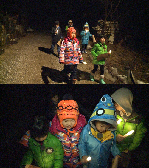 처음으로 아빠도 없이 어두운 밤길을 걸어가야 한다는 사실, 그리고 얼마나 용기가 있는지 보고 싶어 하는 아빠들의 은근한 놀림 때문에 아이들은 잠시 망설이는 듯했지만 보물을 향한 기대감을 갖고 빈집으로 출발했다.