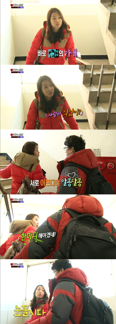 KBS로 출근하던 두 사람은 서로 반가운 마음에 투정을 부리며 깨가 쏟아지는 신혼부부의 모습을 보였다. 특히 정태호 아내는 남편이 감기에 걸렸다는 말에 "팀원들이 안 챙겨줘? 내가 한마디 해야겠네"라며 장난 섞인 말로 애정을 과시해 눈길을 끌었다.