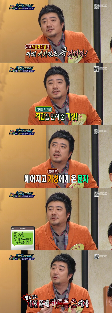 이날 배기성은 "예전에 무슨 상황이 생겨서 식사를 마친 후 지갑을 먼저 여자친구에게 주고 계산하라고 한 후 화장실을 다녀왔다"고 말했다.