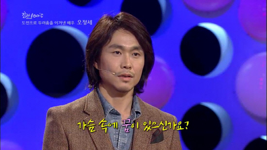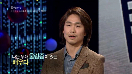 오정세는 22일 KBS1 '강연 100℃'에 멘토로 출연, '두려움은 나의 힘'이란 주제로 꿈과 도전에 관한 이야기를 풀어냈다. 그는 "무대 울렁증이 있는 배우다"며 "연극영화과에 불합격했지만 눈에 띄는 모든 오디션에 접수했다. 7년 만에 단역을 맡아 대사 한 마디를 할 수 있었다. 커튼콜을 하고 무대의 막이 내려오고 불이 꺼지자 눈물이 하염없이 흘렀다. 이런 감정이 행복이란 걸 알았다. 가슴 속에 꿈이 있다면 이런 저런 이유로 꿈을 꺾지 말고 부딪히고 깨지다 보면 꿈과 가까워질 수 있다"고 밝혔다.