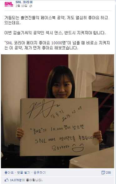 김슬기는 'SNL 코리아'가 재정비 기간을 마치고 새 시즌 방송을 앞두고 있을 당시 'SNL 코리아' 공식 페이스북을 통해 "SNL코리아 페이지 '좋아요'가 1만명을 넘을 경우 방송에서 섹시 댄스를 추겠습니다"라는 공약을 내건바 있다. 이에 포스팅 후 5일 만에 페이지 1만 '좋아요' 달성, 김슬기 공약 사진에도1만 4000개의 '좋아요'가 달렸다. 이후 김슬기도 지난 'SNL 코리아' 제작발표회를 통해 공개적으로 공약을 지킬 것을 약속해 공약이행에 많은 관심이 모아졌다.