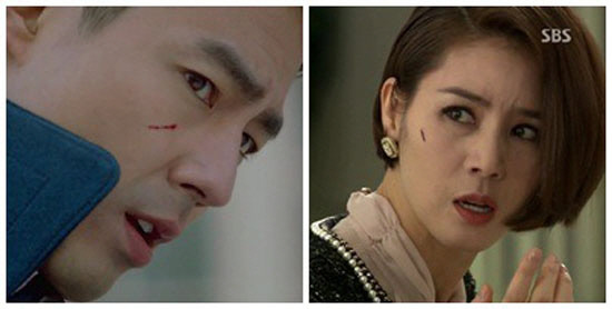 특히 야왕 13회 마지막 부분에, 백합그룹 백창학(이덕화)의 약에 누가 독을 탔는가를 두고, 백도경과 주다해가 극렬하게 맞붙었다. 서로 '네가 탔지?' 공방전을 벌이다가, 급기야 백도경의 손이 올라갔다. 주다해는 백도경의 손을 피하려다 오히려 도경의 뺨에 상처를 입혔다. 덕분에 백도경(김성령)이 '그 겨울 바람이 분다'의 오수(조인성)가 돼버렸다. SBS드라마라고 '야왕'에서 '그겨울'의 간접 홍보해주는 느낌이 들 정도로 웃음이 터진다.