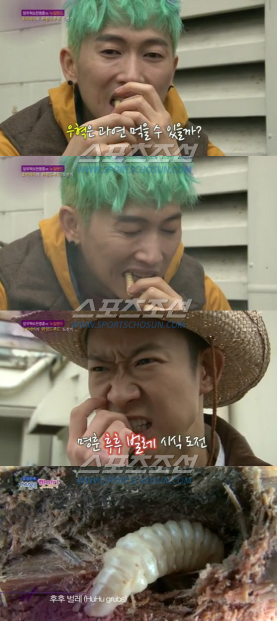 그러나 계속된 권유에 천명훈은 거침없이 머리를 잡고 한 입 베어 물었다 "혐오스러운 벌레지만 우유 맛처럼 매우 고소하다"며 의외의 소감을 말한 그는 장우혁에게도 권했다. 끝까지 거부하던 장우혁은 살짝 구워진 후후 벌레를 들고 한참을 고민하며 이리저리 살피다 조심스럽게 뜯어 먹었다. 이에 천명훈은 "벌레가 입에 닿는 건 상관이 없는데 씹으면 마시멜로가 터지는 느낌"이라며 놀렸고, 벌레를 베어 문 장우혁은 "보기에는 혐오스러운데 굉장히 담백하다"며 "약간 곱창 먹는 같은 느낌"이라고 설명했지만 끝내 들고 있던 나머지 몸통은 먹지 못했다.