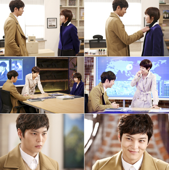 첫 번째 사진은 극 중 길로(주원)와 서원(최강희)이 화장품 판매소로 위장한 국정원 근무처에서 첫 대면한 장면. 길로는 끝까지 거짓말로 일관한 서원에 대한 배신감과 흔들림 속에서도 애써 냉정함을 유지한다. 그러나 '컷' 소리와 함께 주원은 언제 그랬냐는 듯 최강희의 옷깃을 여며주며 미소 짓고 있어 '금사빠(금방 사랑에 빠지는 남자) 주원'이라는 별칭을 실감케 한다.