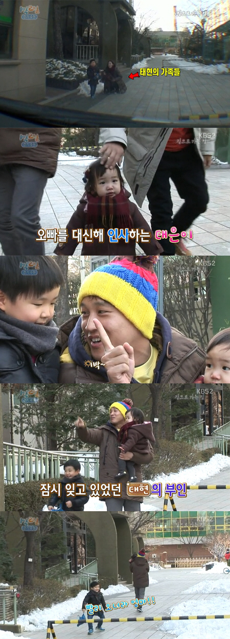 차태현의 부인은 카메라를 피해 몸을 숨겼고, 아들 수찬 군과 딸 태은 양은 아빠가 반가운 듯 품에 안겼다. 카메라 앞에서 수줍어하는 수찬 군과 달리 태은 양은 오빠 대신 카메라를 향해 배꼽 인사를 하며 애교를 발산했다.