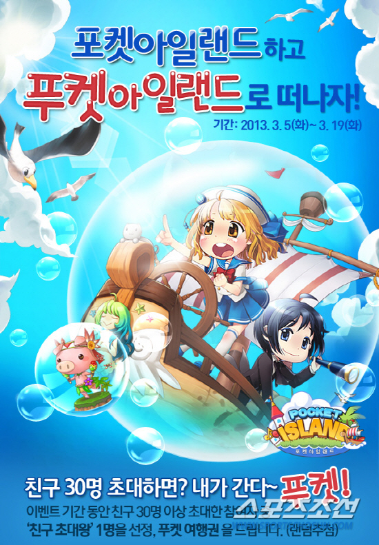 컴투스는 '포켓아일랜드 for Kakao'의 출시를 기념해 5일부터 19일까지 '포켓아일랜드하고, 푸켓아일랜드로 떠나자!' 이벤트도 함께 진행한다. 이벤트 기간 동안 게임을 다운로드 받고 친구 30명 이상을 초대하면 무조건 '귀요미 탐험선' 아이템을 선물하고, 추첨을 통해 동반 1인까지 함께 이용 가능한 푸켓 여행권, 스타벅스 기프티콘 등을 선물한다. 남정석 기자 bluesky@sportschosun.com