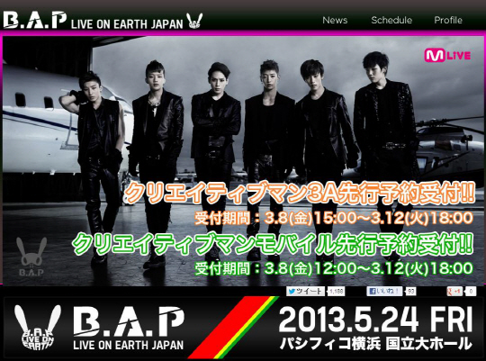B.A.P 콘서트 주최 측인 일본 최대의 공연 업체 크리에이티브맨의 관계자는 "어제 오후 12시 홈페이지에 'B.A.P LIVE ON EARTH JAPAN' 관련 공지만 게재했을 뿐인데 문의전화가 폭주하고 있으며 서버가 마비되는 등 일본 팬들의 열광적인 반응이 벌써부터 시작됐다"고 전했다.
