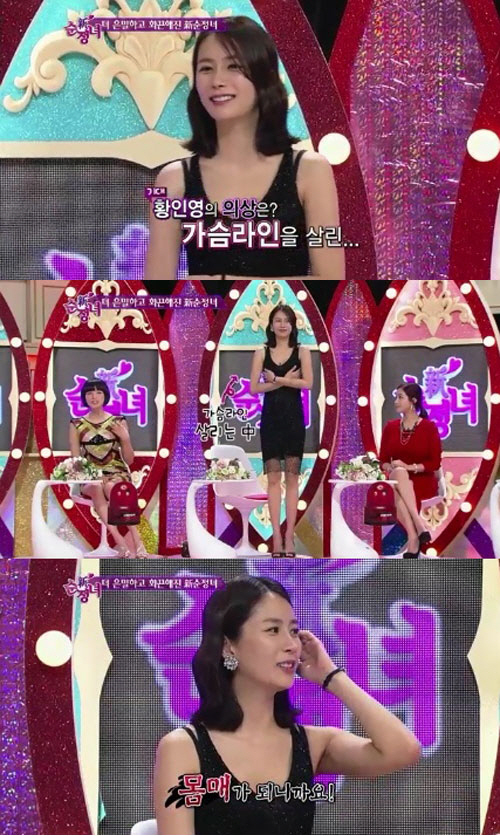 이에 솔비가 "노출을 은근히 즐기시는 것 같다"고 말하자, 황인영은 "몸매가 되니까"라고 당당하게 말해 눈길을 끌었다.