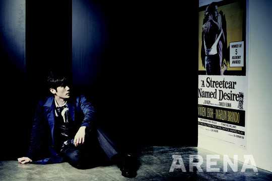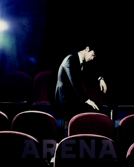 배우 김강우가 남성지 아레나 3월호 화보에서 영화 상영을 기다리는 한 남자의 모습을 분위기있게 표현했다.