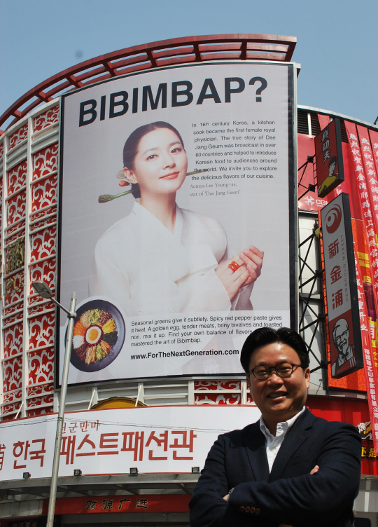 지난 2월 뉴욕타임스에 이영애 비빔밥 전면광고를 실어 큰 화제를 불러 일으킨 한국 홍보 전문가 서경덕 성신여대 교수가 이번에는 중국 상하이 중심가에 같은 디자인의 대형 빌보드 광고를 올렸다고 11일 밝혔다.