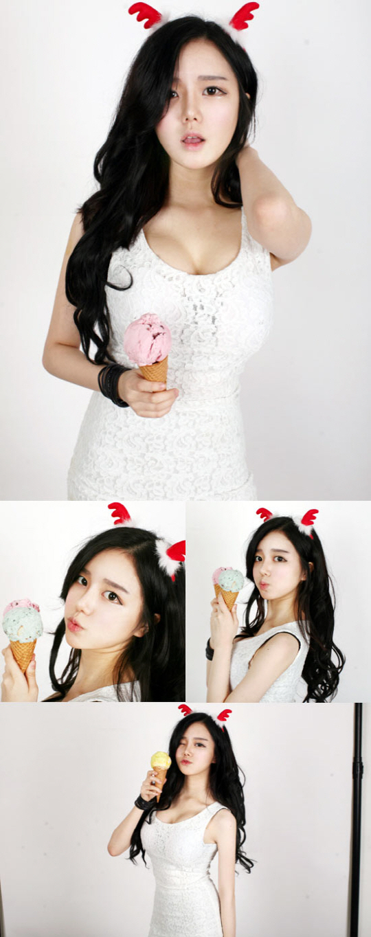 사진은 레이스 장식이 돋보이는 밀착된 흰색 미니드레스를 입은 고두림이 깜찍한 루돌프 머리띠를 하고 아이스크림을 든 모습이 담겨있다. 갖갖이 표정으로 매력을 발산하고 있는 고두림은 청순한 미모와는 달리 볼륨감 넘치는 놀라운 반전 몸매로 이목을 집중시키고 있다.