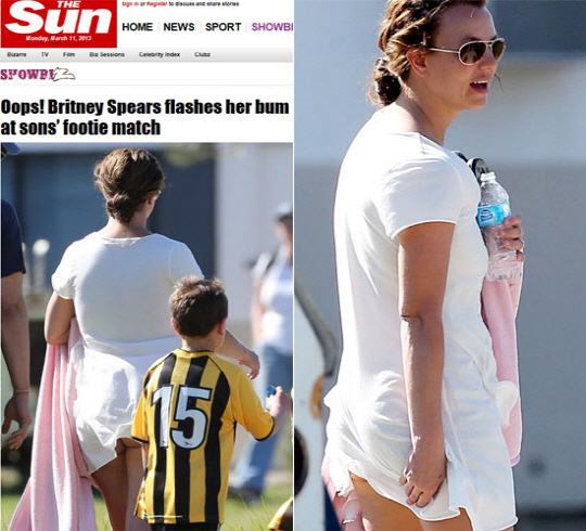 이날 학부모 자격으로 참석한 스피어스는 두 아들의 축구 경기를 행복한 표정으로 지켜보며 즐거운 시간을 보냈다. 그런데 하늘거리는 흰색 반팔 원피스를 입은 그녀는 바람이 불 때마다 엉덩이가 노출되는 민망한 상황을 들켰다.