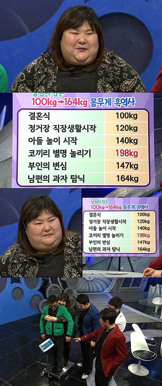 코끼리녀는 "키 165cm에 몸무게가 164kg이다. 결혼 전에 100kg 가까이였다"며 "결혼 후 최고 몸무게는 198kg에 달했다"고 고백했다.
