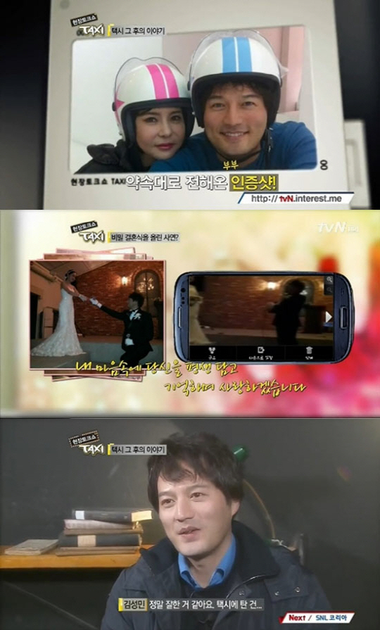김성민은 지난 11일 방송된 케이블 채널 tvN '현장토크쇼 택시'에 출연한 김성민은 제작진에게 선물 받은 커플 헬멧을 쓴 인증샷을 공개하며 아내를 드러냈다.