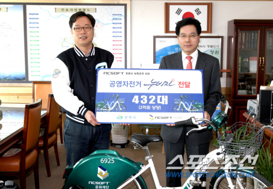 엔씨소프트문화재단은 NC 다이노스의 연고지 창원시에 지역 사회공헌 활동의 일환으로 3억원 상당의 시민공영자전거 '누비자' 432대를 12일 전달했다.