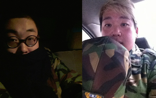 이날 공개된 사진 속 투빅(지환, 준형)은 각각 예비군복 차림에 차량을 타고 퇴근하는 모습으로 모처럼 군복을 입은 탓인지 어색해 보이는 표정이 눈에 띈다.
