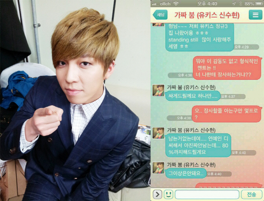 공개 된 캡쳐본은 가짜 붐이라는 이름으로 저장 돼 있는 유키스의 수현과 신동이 나눈 카카오톡 대화내용. 신동에게 다소 경직된 글로 유키스의 새로운 앨범을 홍보하고 수현과 "장사하냐"라며 재치 있는 대화내용이 보는 이들로부터 웃음을 자아냈다.