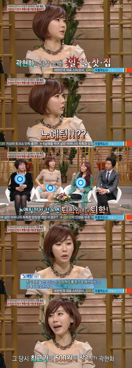 이날 곽현화는 "그때 일일 찻집과 노예팅을 했다"며 학창시절 탈선 경험에 대해 털어놨다. 이어 "요즘은 어떤지 모르겠는데 그때 노예팅은 그냥 앞에 나가서 개인기 보여주고 인기의 척도를 돈으로 매기는 것이었다"고 덧붙였다.